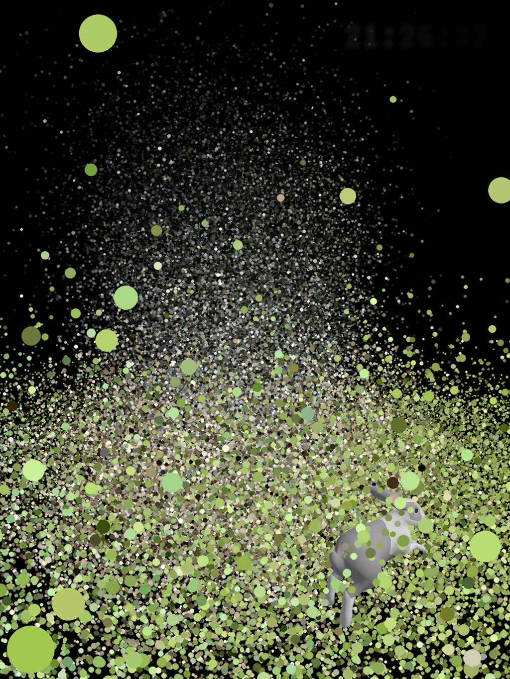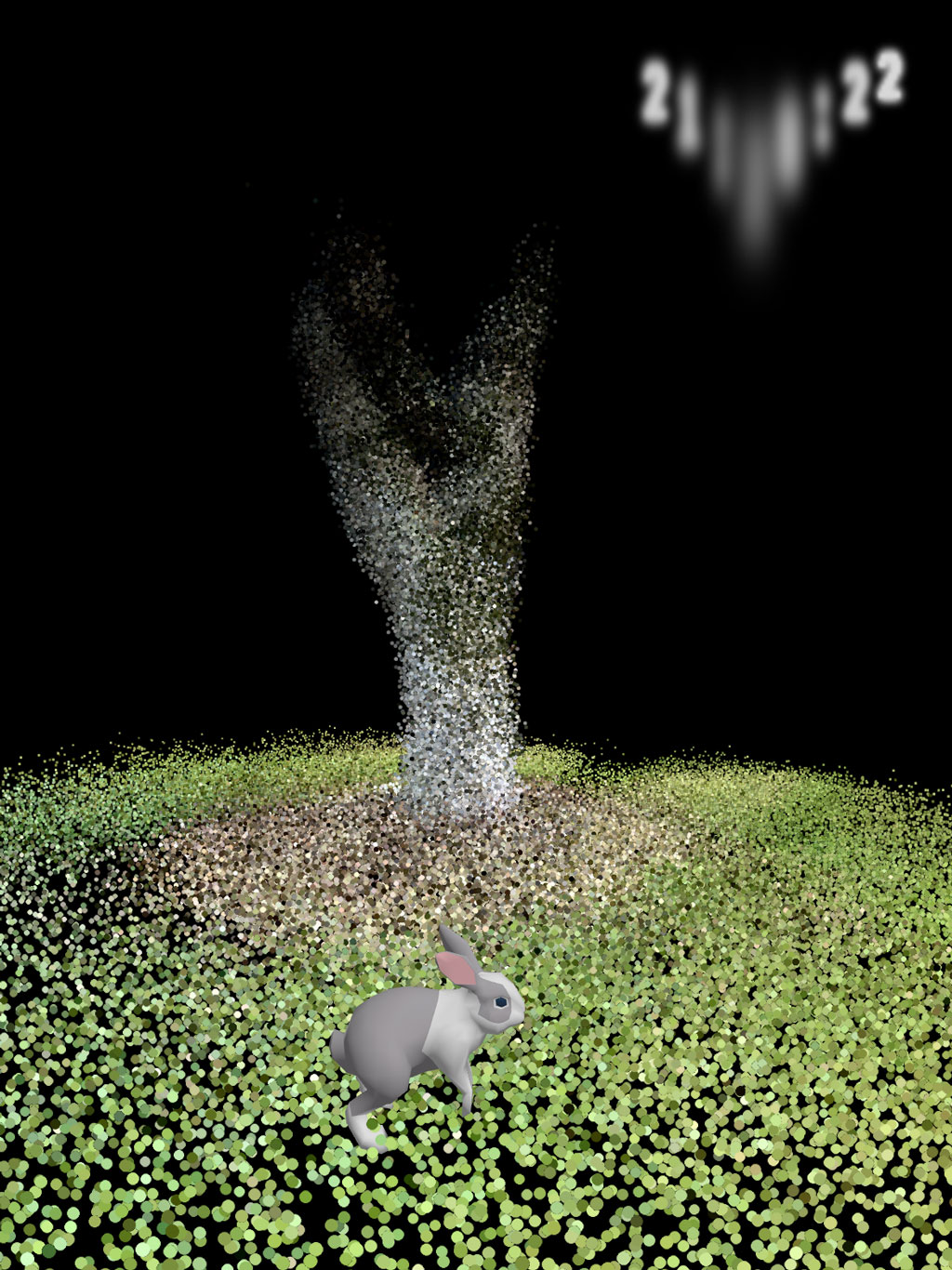 토끼는 진동하는 들판을 달리는 것처럼 보이지만, 실제로는 어떠한 지면도 딛고 있지 않으며 자신의 궤도를 벗어나지 않는다. 나무의 점입자들은 실시간으로 입력되는 자극에 의해 본래의 좌표값에서 이탈한다. 이는 종속된 움직임이다. 두 존재는 동일한 좌표 공간에 놓였으나 서로 다른 현실 위에 있다.